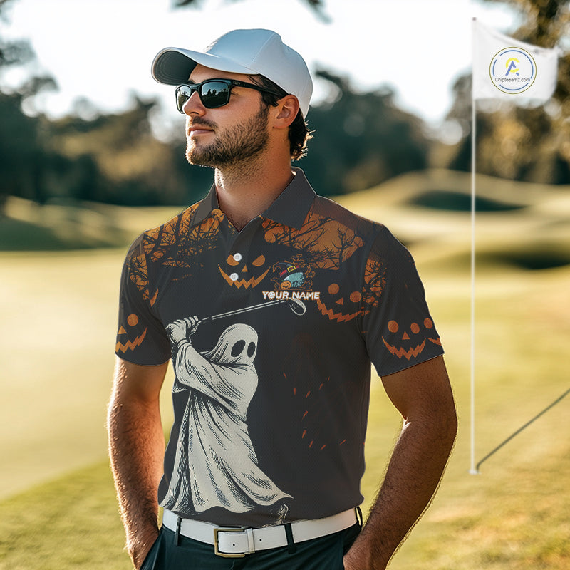 Funny black and orange Ghost Golfer Halloween Golf Polo Shirt For Men Custom golf attire for men NQS10767