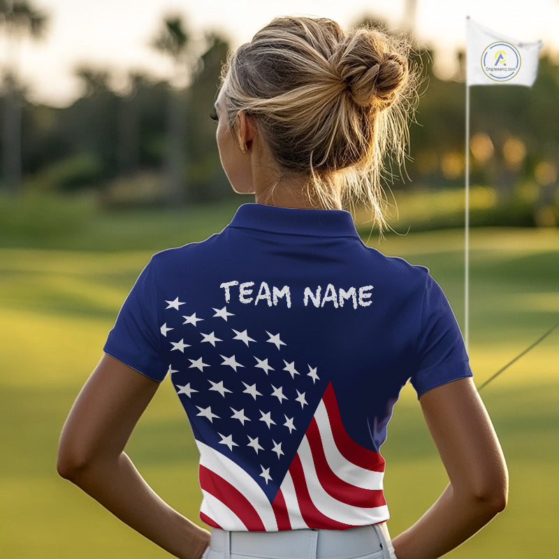 Red, White and Blue American Flag Skull Golf polo shirts for Women custom patriotic ladies golf top NQS10851
