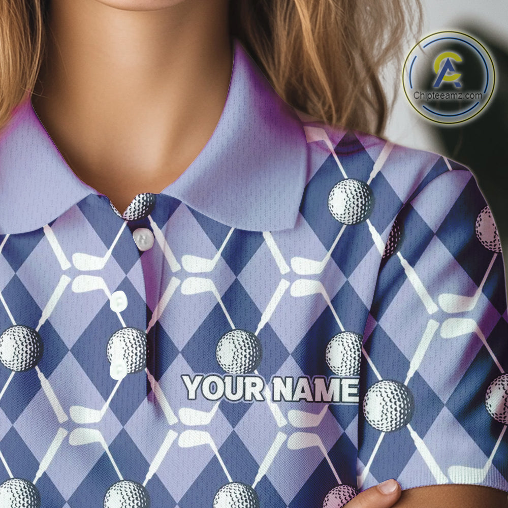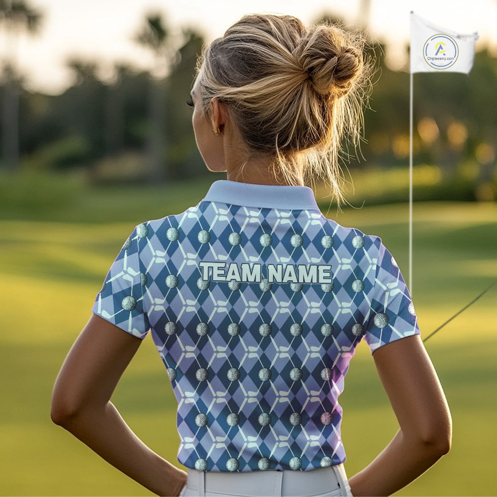Women golf polo shirts custom blue argyle plaid pattern golf attire for ladies, golfer gifts NQS10434