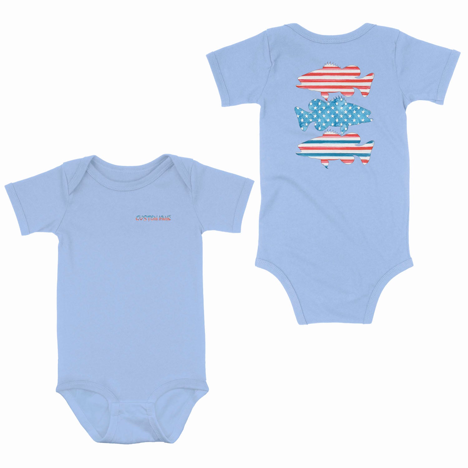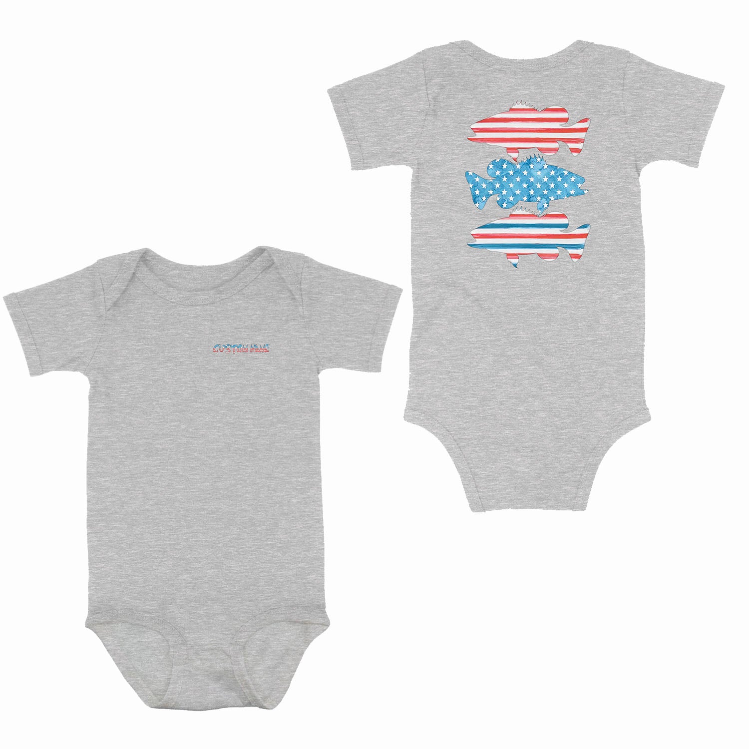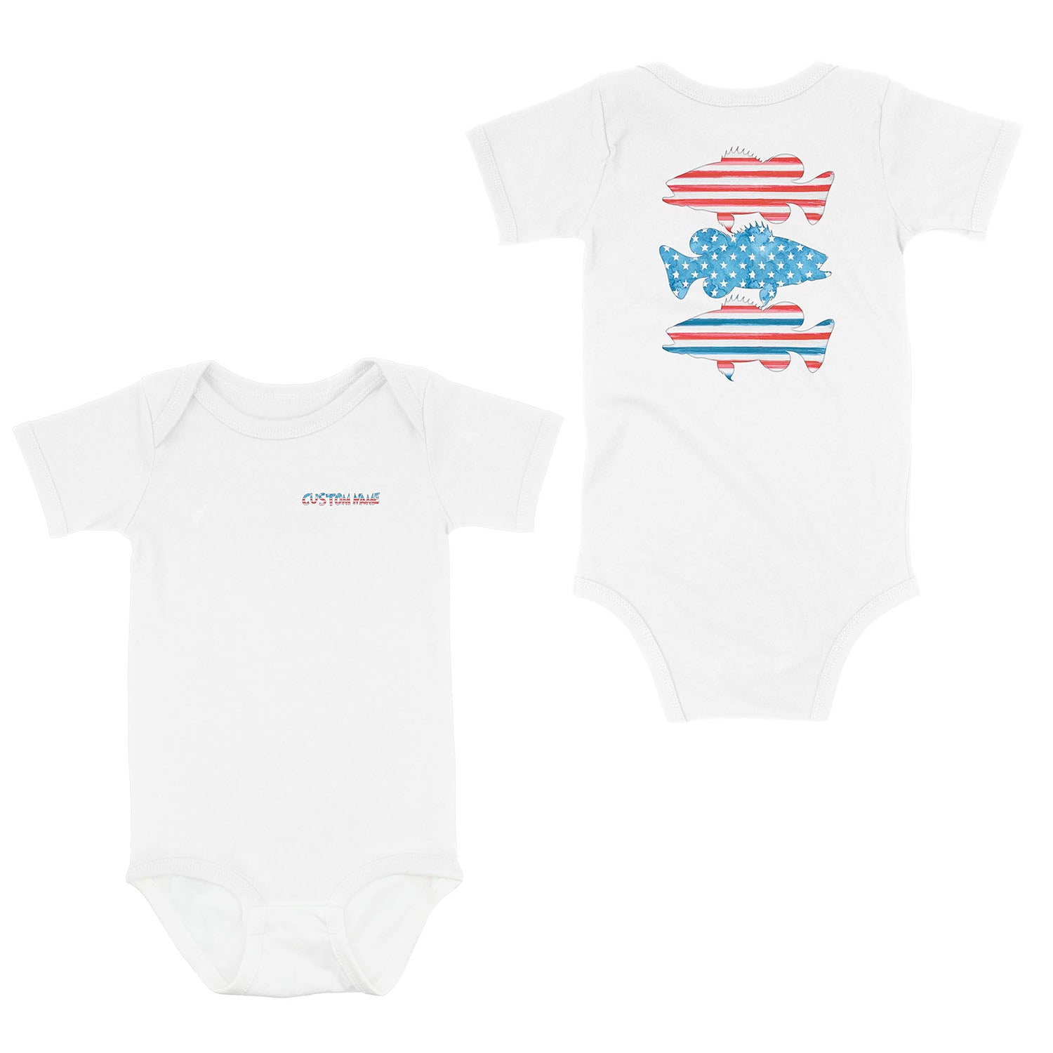Personalized Patriotic Largemouth Bass Infant Fishing Shirts, American Flag Bass Baby Onesie IPHW7133