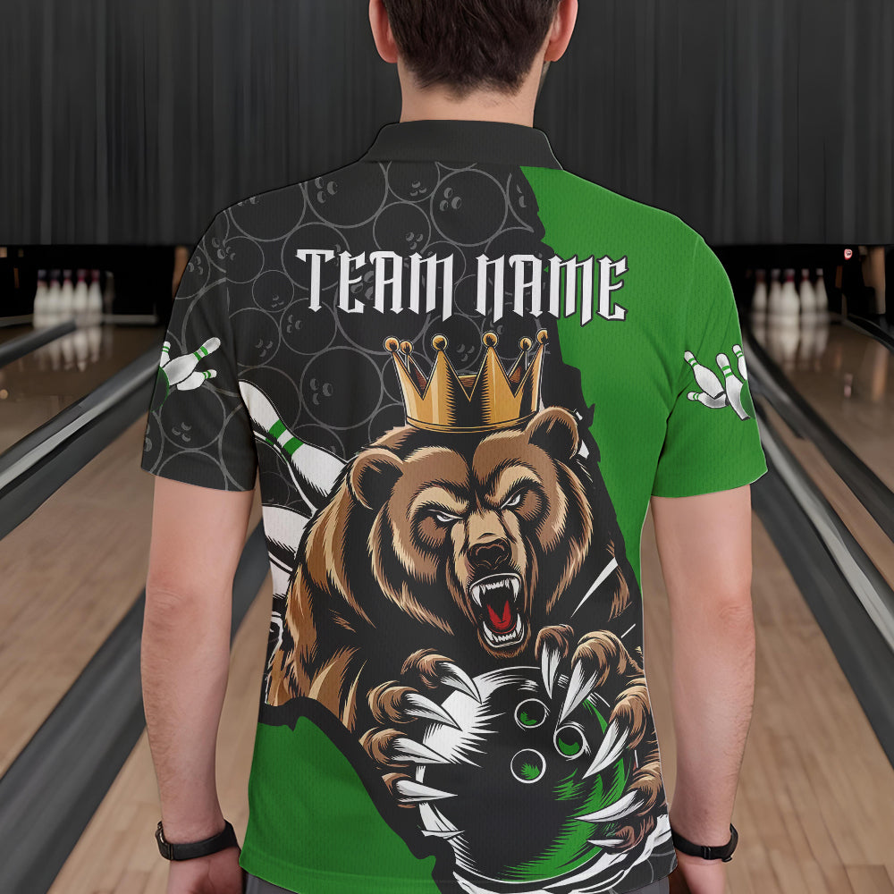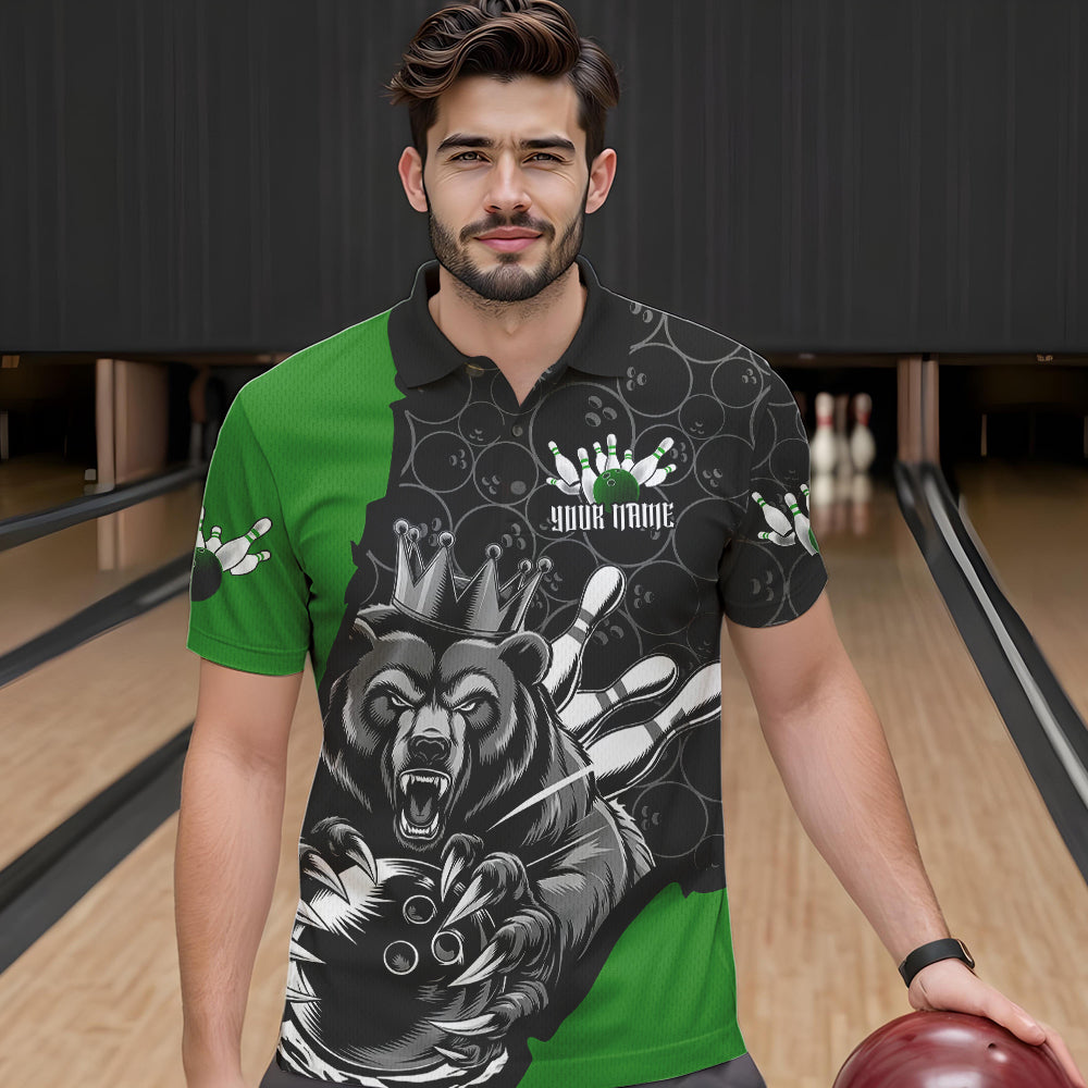 Black And Green Custom Bear Bowling King Polo Shirts For Men, Bear Bowling Team Uniform IPHW8838