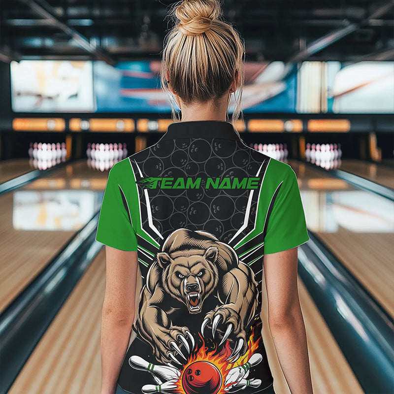Black And Green Custom Bear Bowling Jerseys, Bear Bowling Team Polo Shirts For Women IPHW8832
