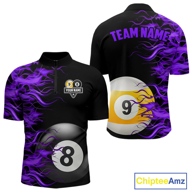 Purple Flaming 8 Ball & 9 Ball Billiard Shirt For Men Custom Pool Team Jersey Polo & 1/4 Zip TDM4713