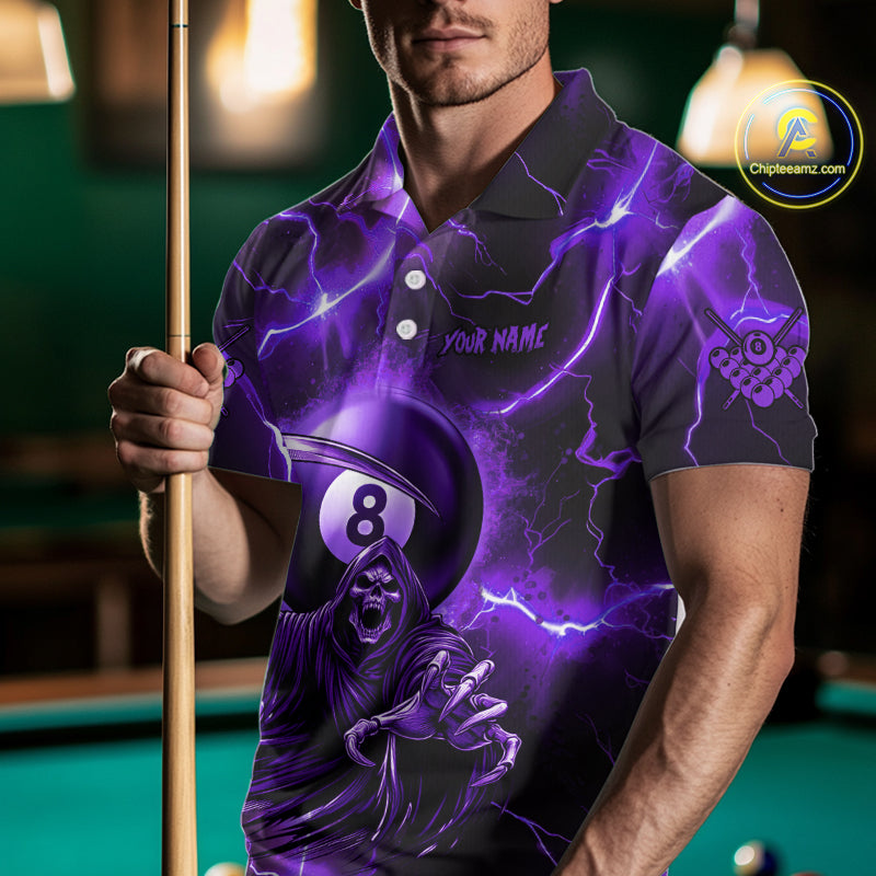 Purple Grim Reaper 8 Ball Men's Billiard Shirt Custom Thunder Lightning Halloween Pool Team Jersey TDM4874
