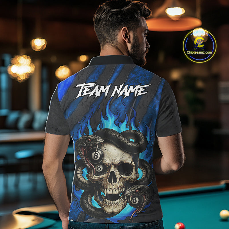Personalized Skull And Snakes Flame Billiard Shirt For Men Custom 8 Ball Pool Team Jersey |Blue TDM5085
