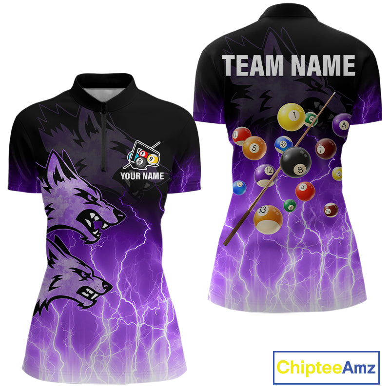Custom Billiard Shirt For Women, Purple Thunder Lightning Wolf Pool Balls Team Jersey Polo & 1/4 Zip TDM4559