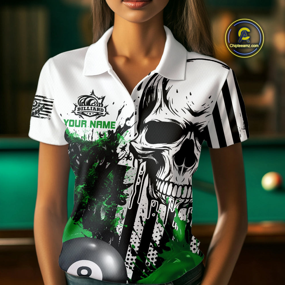Personalized Green Grunge Skull Billiards Shirts For Women Custom Retro Billiard Team Jerseys Attire TDM4650