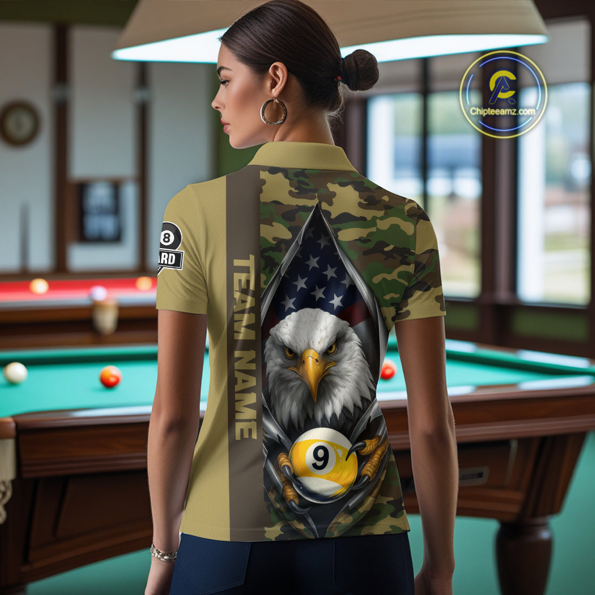 Green Camo American Flag Eagle 8 Ball & 9 Ball Pool Jersey For Women Custom Billiard Team Shirt TDM4659