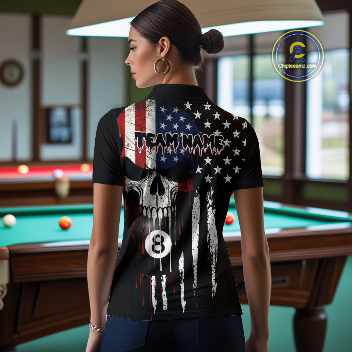 Grunge American Flag Skull 8 Ball Billiard Shirt For Women Custom Patriotic Pool Team Jersey TDM5042