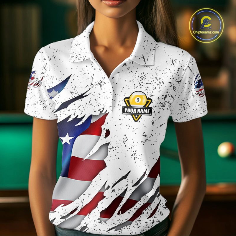 9 Ball Pool US Flag White Grunge Custom Women's Billiard Shirt, Patriotic Billiard Team Jersey TDM5138