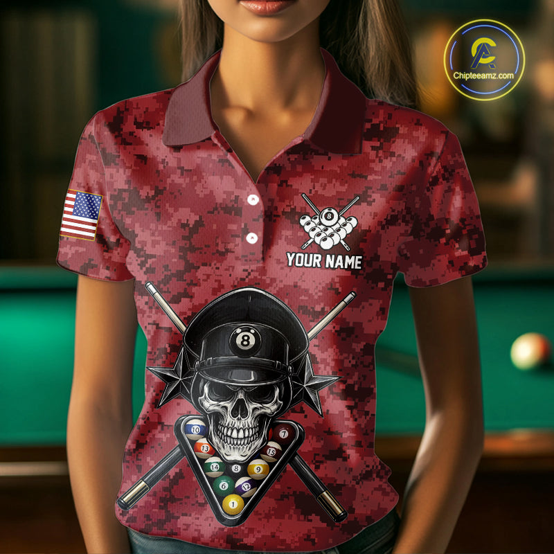 Personalized Red Camo Skull Billiard Shirt For Women Custom Patriotic US Flag Pool Team Jersey TDM5165