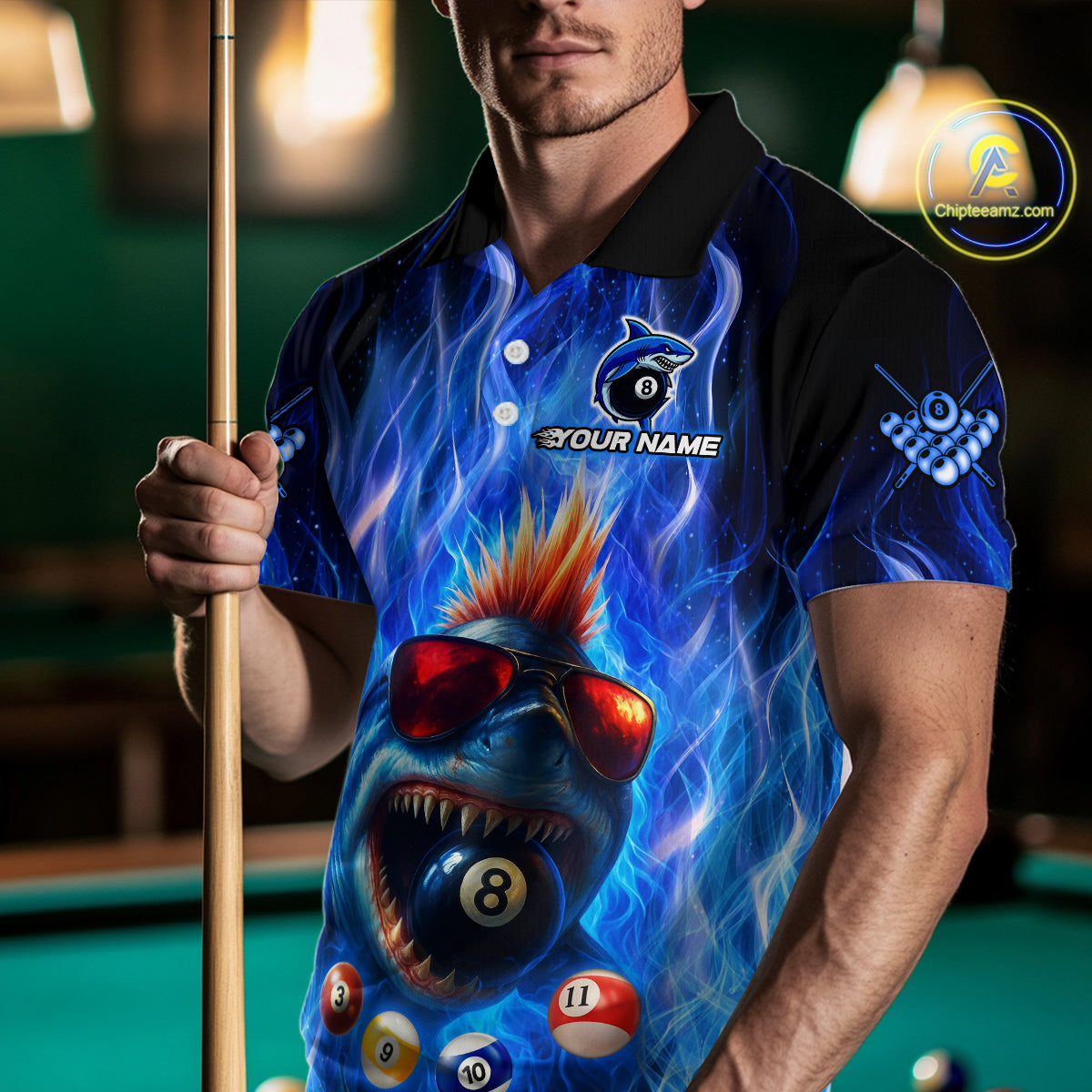 Personalized Blue Funny Shark Flame Men's Billiards Shirts Custom 8 Ball Billiard Team Jersey TDM5214
