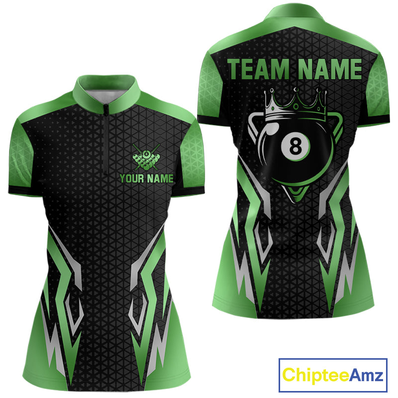 Black And Green 8 Ball Pool Crown Billiard Shirt For Women Custom Billiard Jersey Polo & 1/4 Zip TDM4991