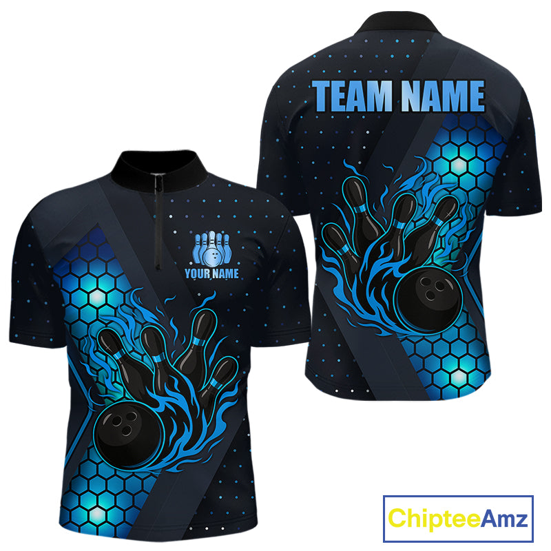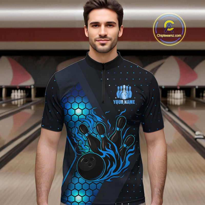 Black and Blue Flame Bowling Polo, 1/4 Zip Shirts for Men Custom Bowling Team Jersey Bowler Outfit NQS10925
