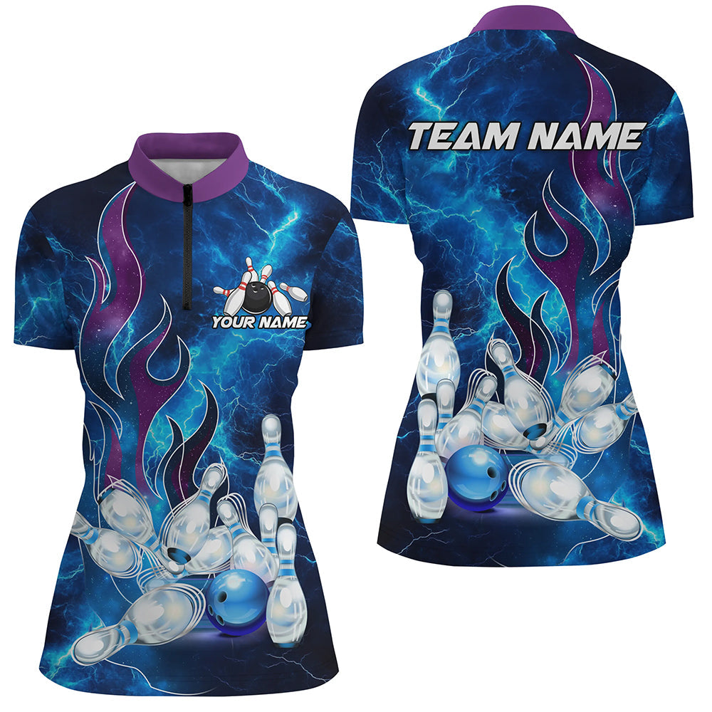 Blue Lightning Thunder Bowling Polo, 1/4 Zip Shirt For Women Purple Flame Custom Team Bowler Jerseys NQS8614