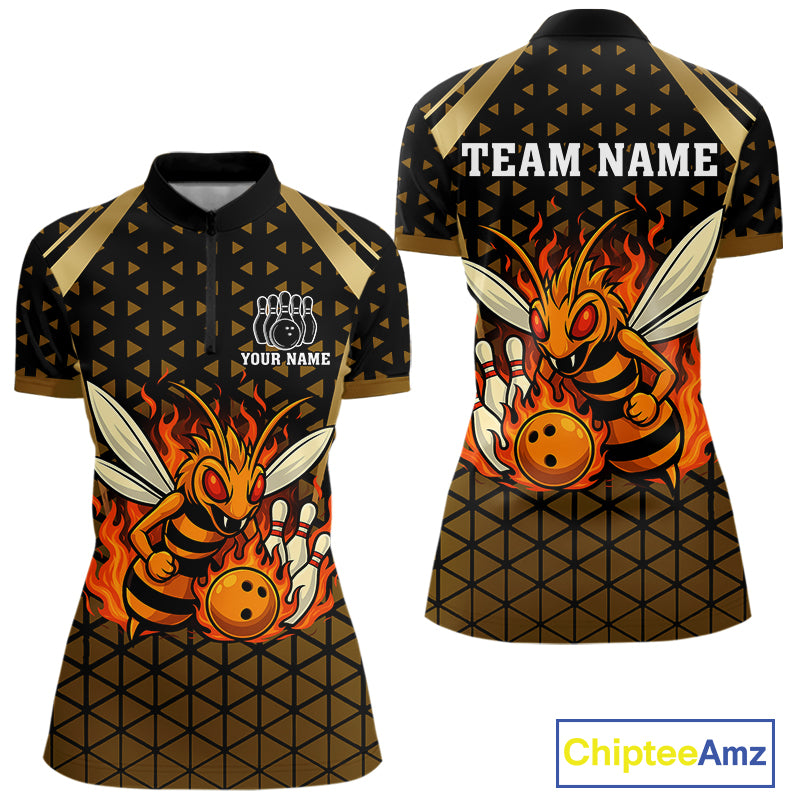 Custom Black and Gold Bee Bowling Polo, Quarter Zip Shirts For Women, Bee Bowling Team Bowlers Outfit NQS10911