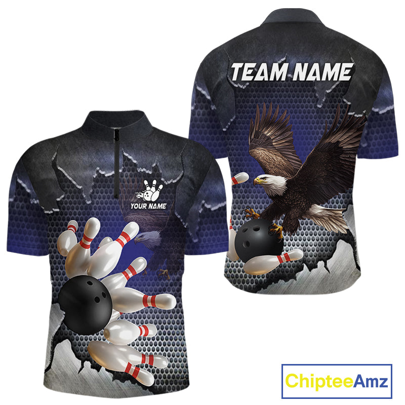 Eagle Bowling Polo, Quarter Zip Shirts for Men Custom Team Bowling jerseys, gift for bowlers | Blue NQS10972