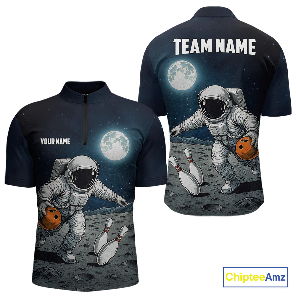 Funny Astronaut Bowling Polo, Quarter Zip Shirts For Men Custom Bowling Team Outfit, Gift For Bowler NQS10694