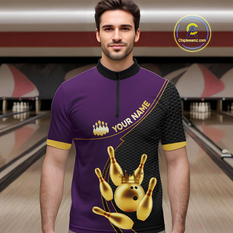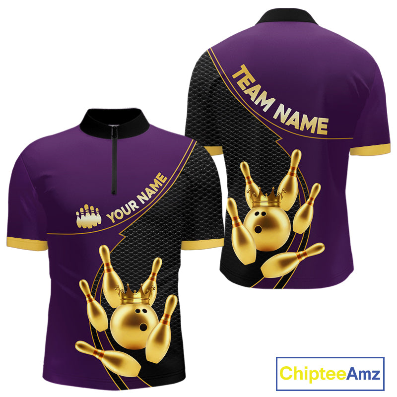 Purple and Gold Bowling shirts for men Custom Team Bowling Polo, 1/4 zip Shirt bowlers Outfit NQS10987
