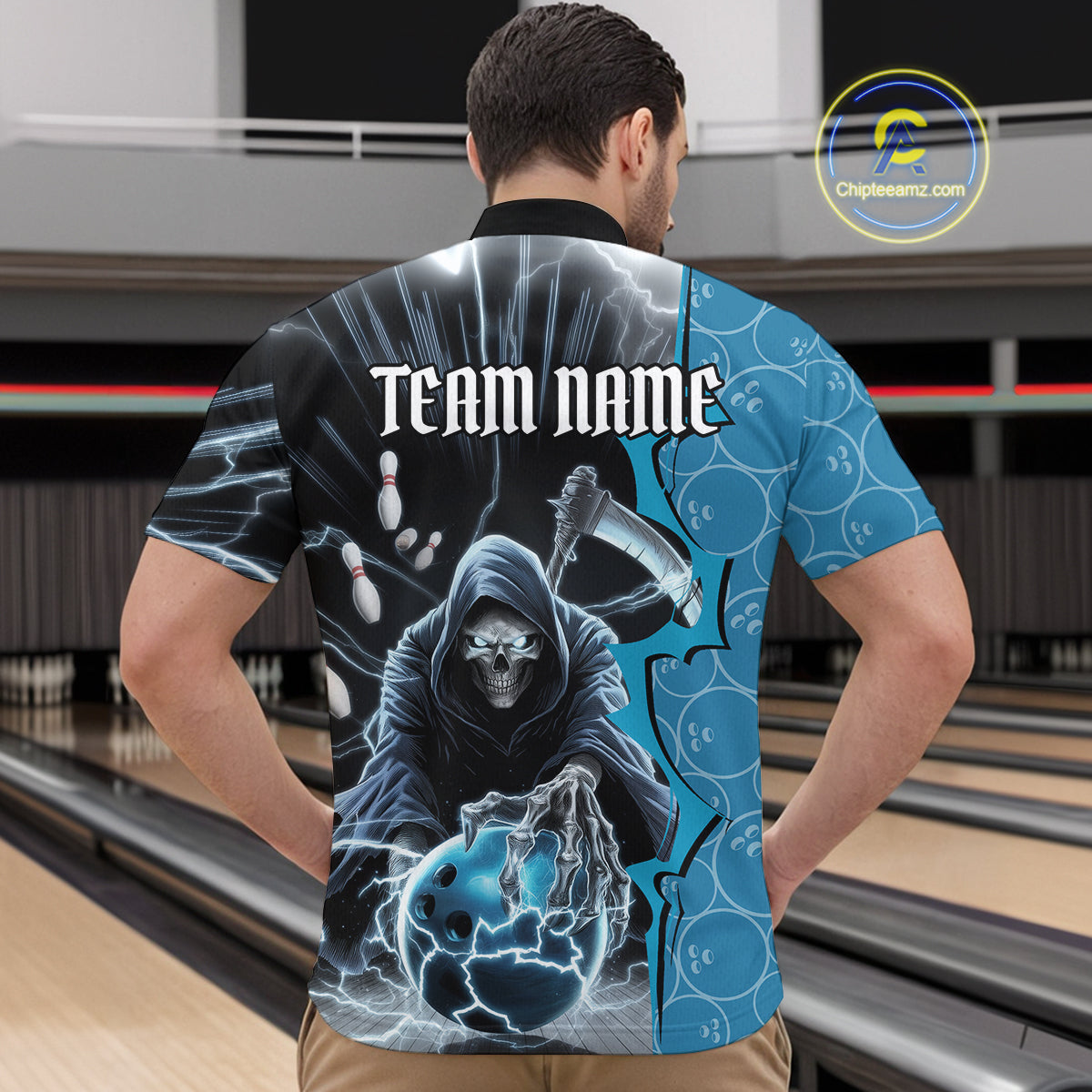 Custom Blue Thunder Lightning Grim Reaper Bowling Men Quarter-Zip Shirt, Halloween Bowler Outfit IPHW9839