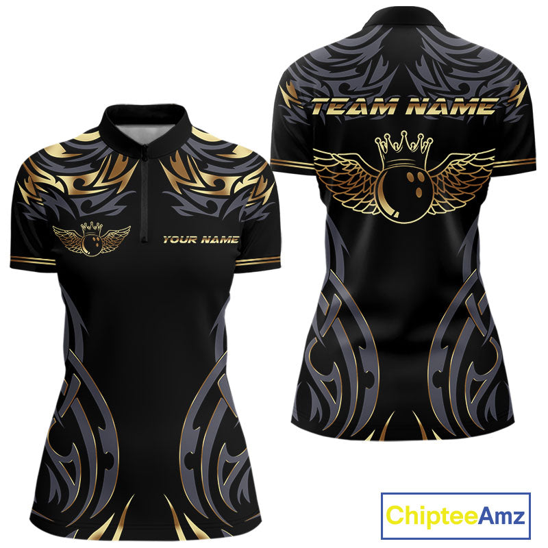 Personalized Black And Gold tribal pattern Bowling Shirts For Women, angel wings Bowling Team jerseys NQS10298