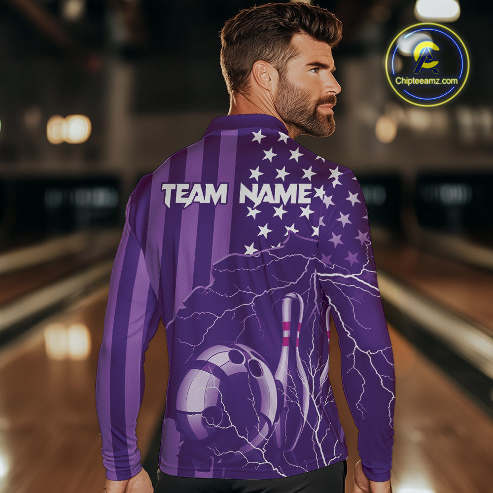 Personalized Purple American flag Lightning thunder Custom Bowling Team Shirts For Mens Bowling Jersey NQS9858