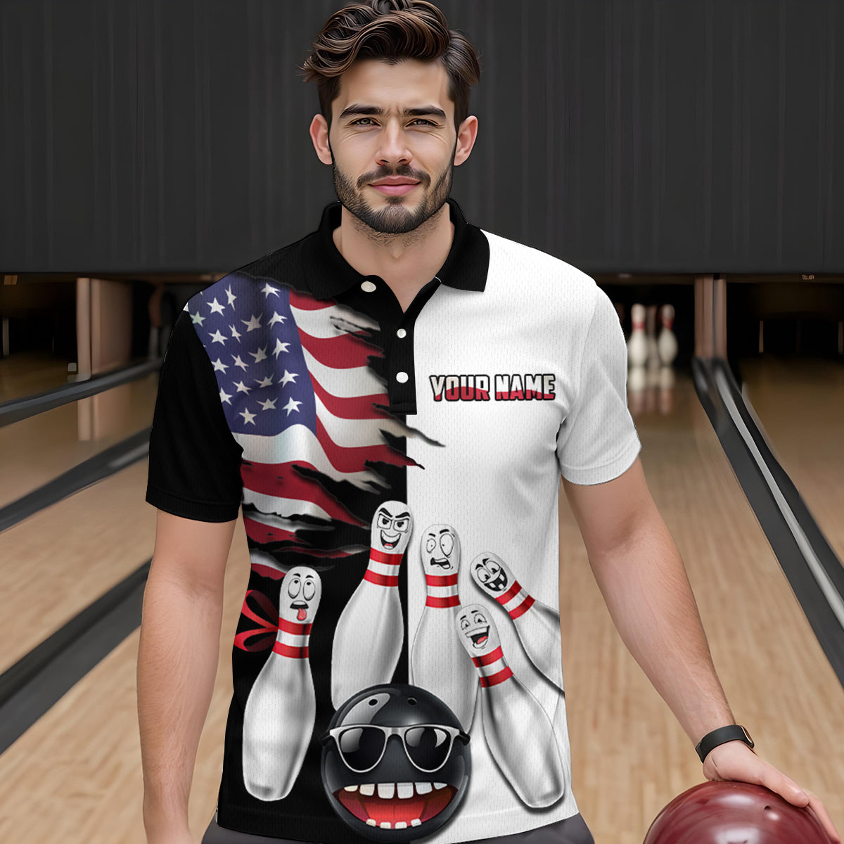 US Flag Bowling Shirt Funny Black & White Bowling Jersey Men Polo Performance Bowling Shirt QZT263