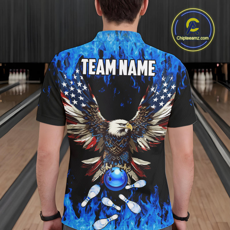 Blue flame Mens bowling polo shirts Custom American flag Eagle Team bowling shirts, gift for bowlers NQS7403