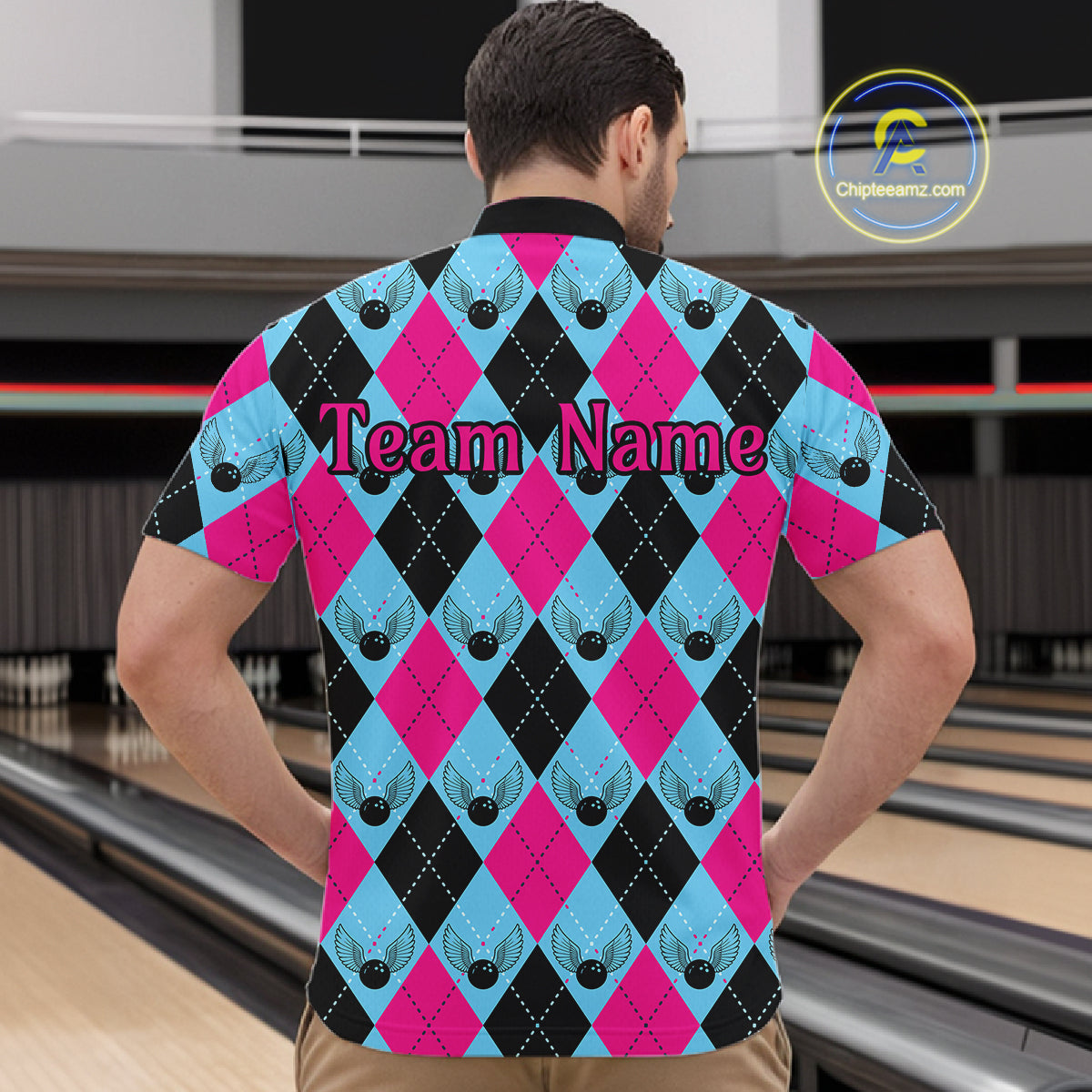 Blue And Pink Argyle Pattern Custom Bowling Shirts For Men, Personalized Bowling Team Shirt IPHW7306
