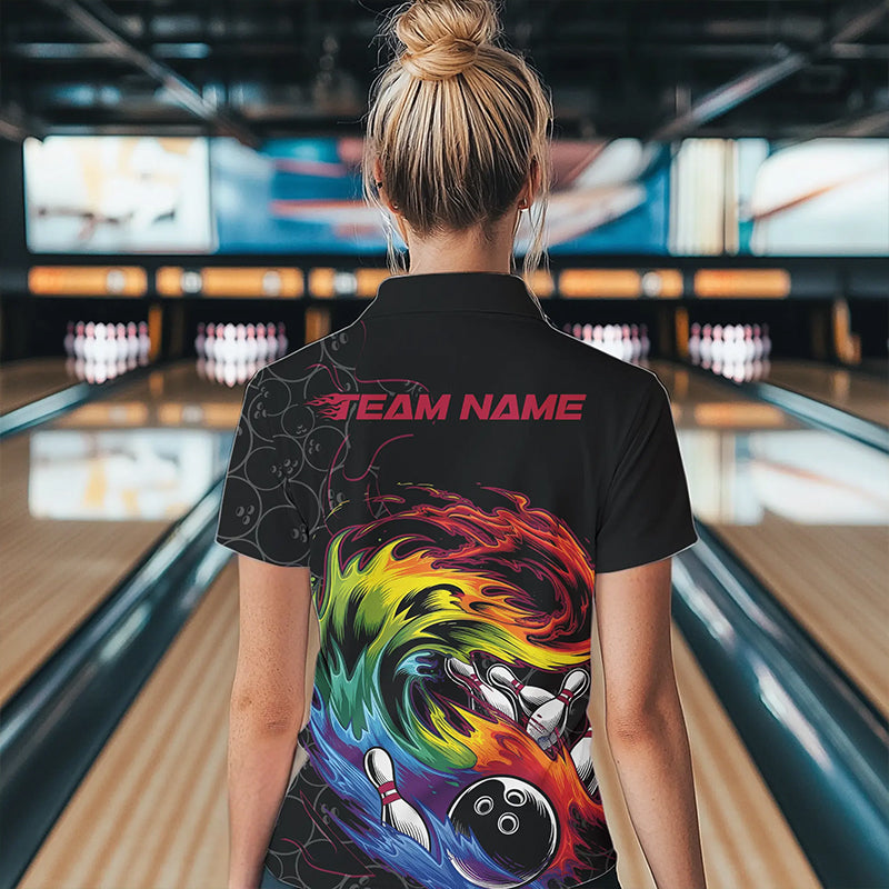 Custom Rainbow Flame Bowling Team Polo Shirts For Women, Colorful Bowling League Shirt IPHW8740