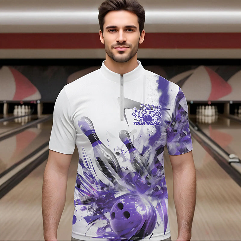 Custom White And Purple Custom Bowling Quarter-Zip Shirts For Men, Bowling Tournament Team Shirt IPHW8462