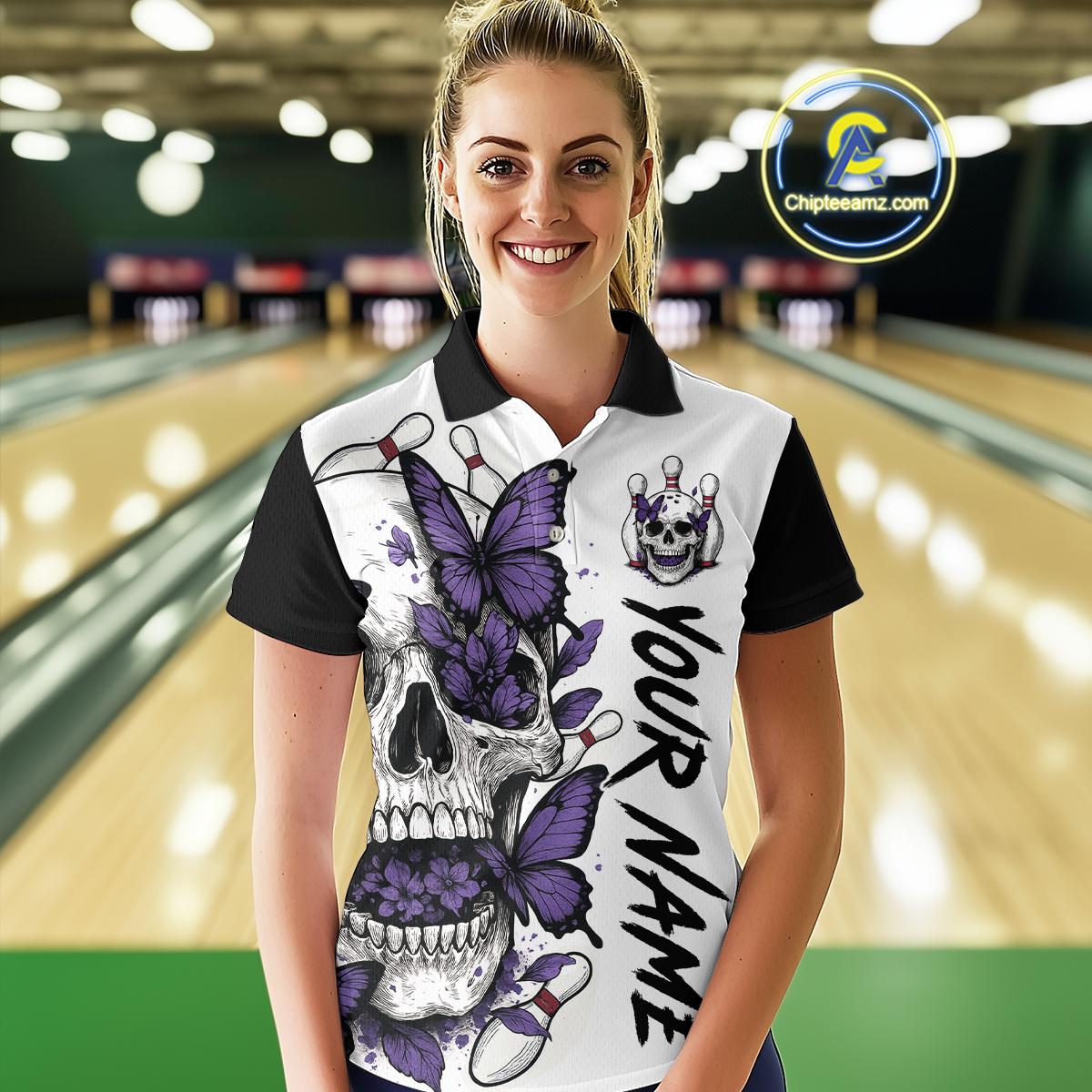 Purple Butterfly Skull Bowling Women Bowling Shirt Polo & Quarter-Zip Bowling Team Jerseys HNT80
