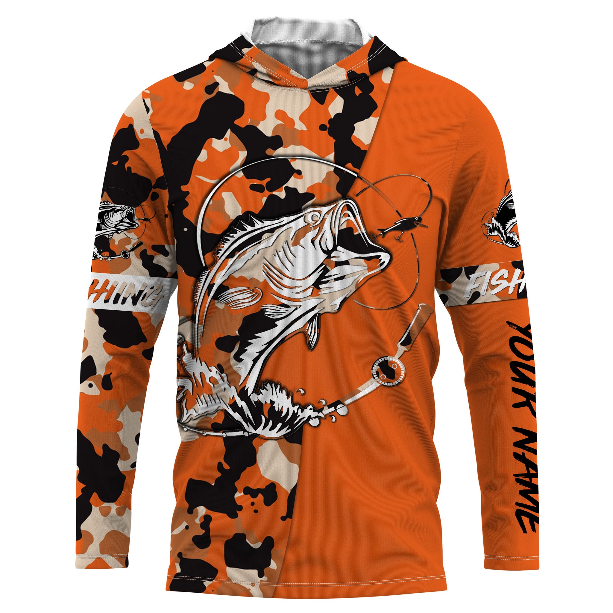 Custom Name bass fishing tattoos Camouflage Orange shirt Performance Fishing Shirt, Bass Fishing Jerseys NQS2479