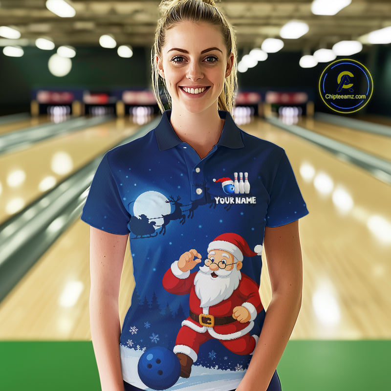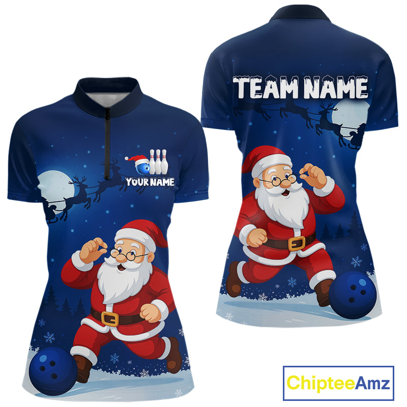 Custom Blue Funny Christmas Santa Bowling Polo, 1/4 Zip Shirt For Women, Bowling Team League Jersey NQS10827