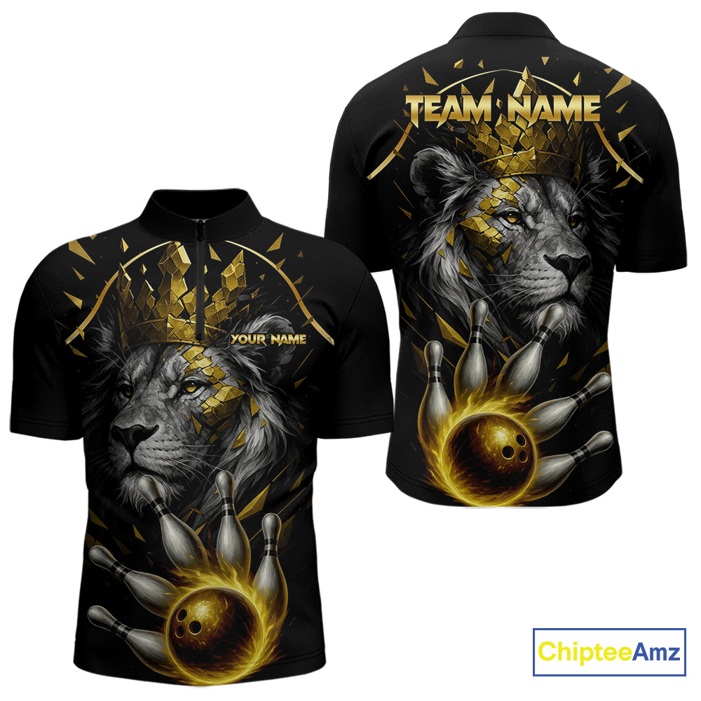 Custom Black and Gold Lion Bowling Polo, Quarter Zip shirts for Men, Lion Team Bowling Jerseys NQS10231