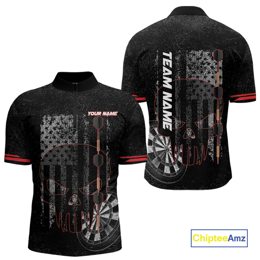 Black & White grunge American Flag Skull Mens Darts Shirt Custom patriotic Team Darts Jersey | Red NQS10749