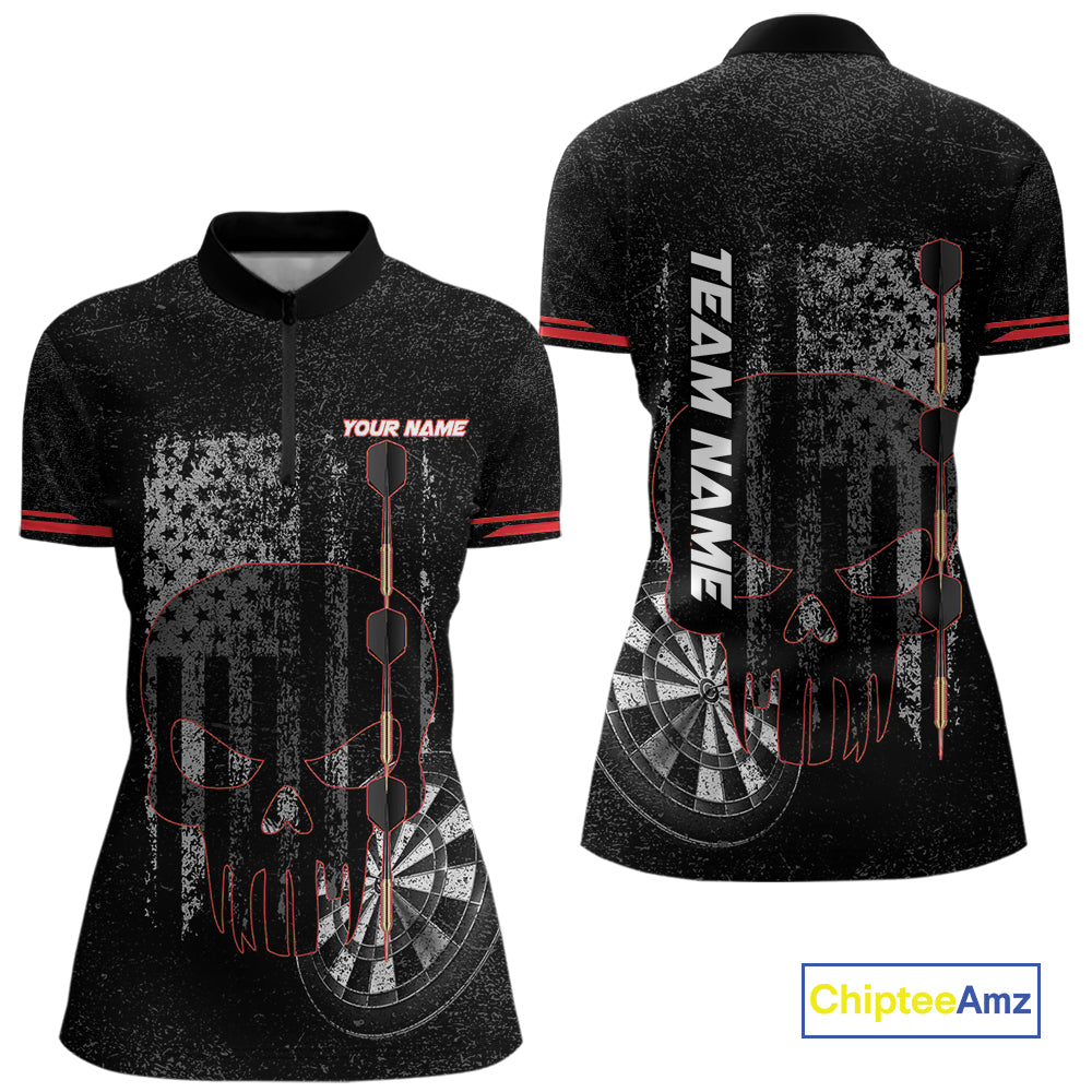 Black & White grunge American Flag Skull Women Darts Shirt Custom patriotic Team Darts Jersey | Red NQS10749