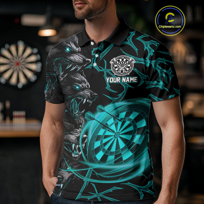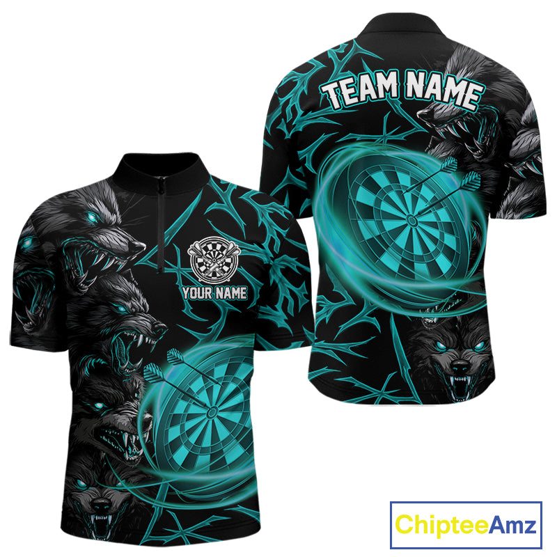 Personalized Wolf Dart Shirts For Men Custom Lights Dartboard Darts Team Jerseys |Turquoise TDM4670