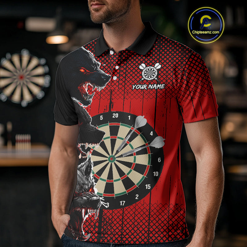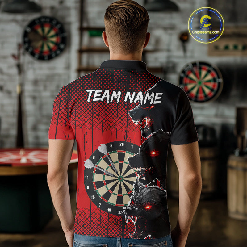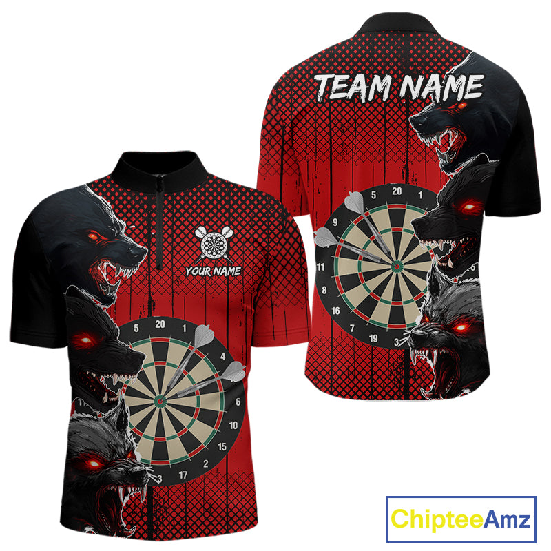 Personalized Red Grunge Wolf Darts Shirt For Men Custom Funny Darts Jersey Team Polo & 1/4 Zip TDM4672