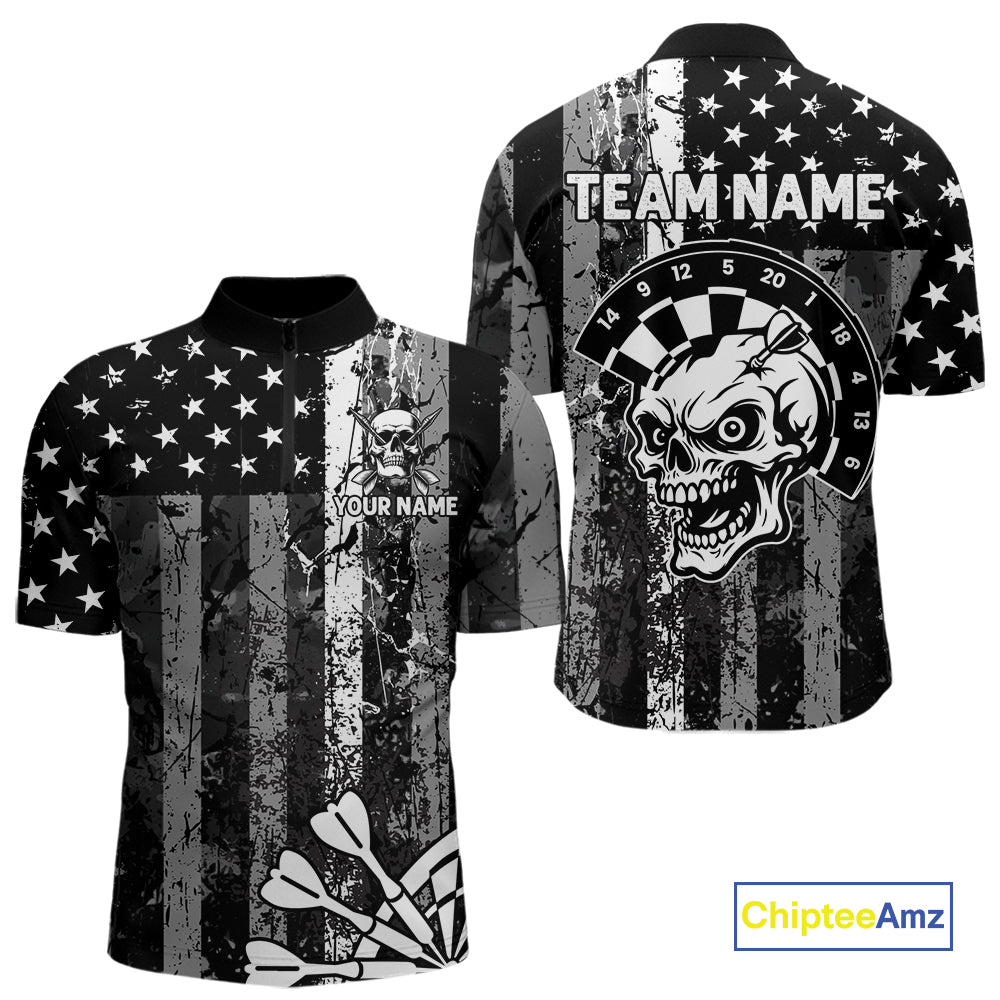 Personalized White Black Grunge US Flag Skull Darts Shirt For Men Custom Patriotic Darts Jersey TDM4883