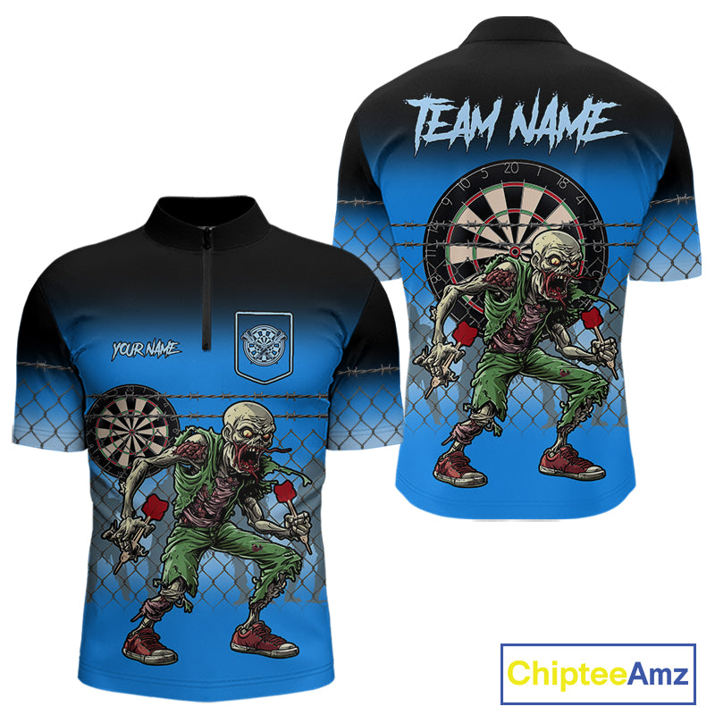 Blue Funny Zombie Dart Shirt With Pocket Option For Men Custom Darts Jersey TDM4937