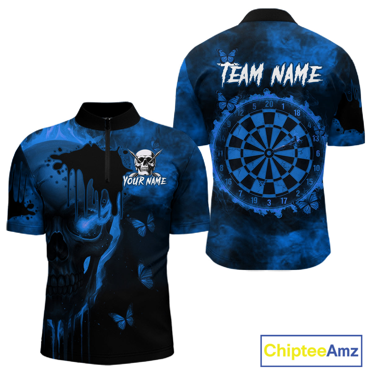 Black And Blue Grunge Skull Butterflies Darts Shirt For Men Custom Dart Jersey Team Polo & 1/4 Zip TDM4993