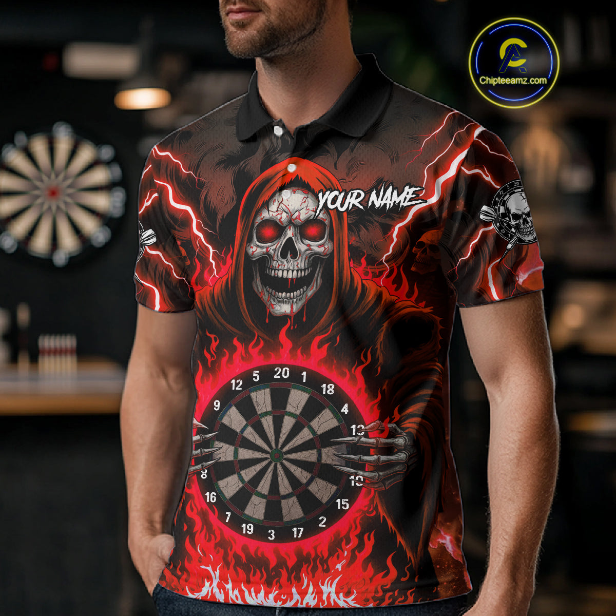Red Grim Reaper Thunder Lightning Mens Dart Shirts Custom Flame Dart Jerseys Team Polo & 1/4 Zip TDM5175