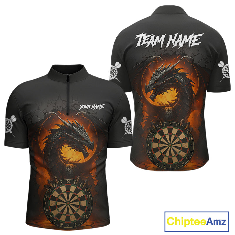 Personalized Black Grey Dragon Darts Shirt For Men Custom Fire Dart Jersey Team Polo & 1/4 Zip TDM5179