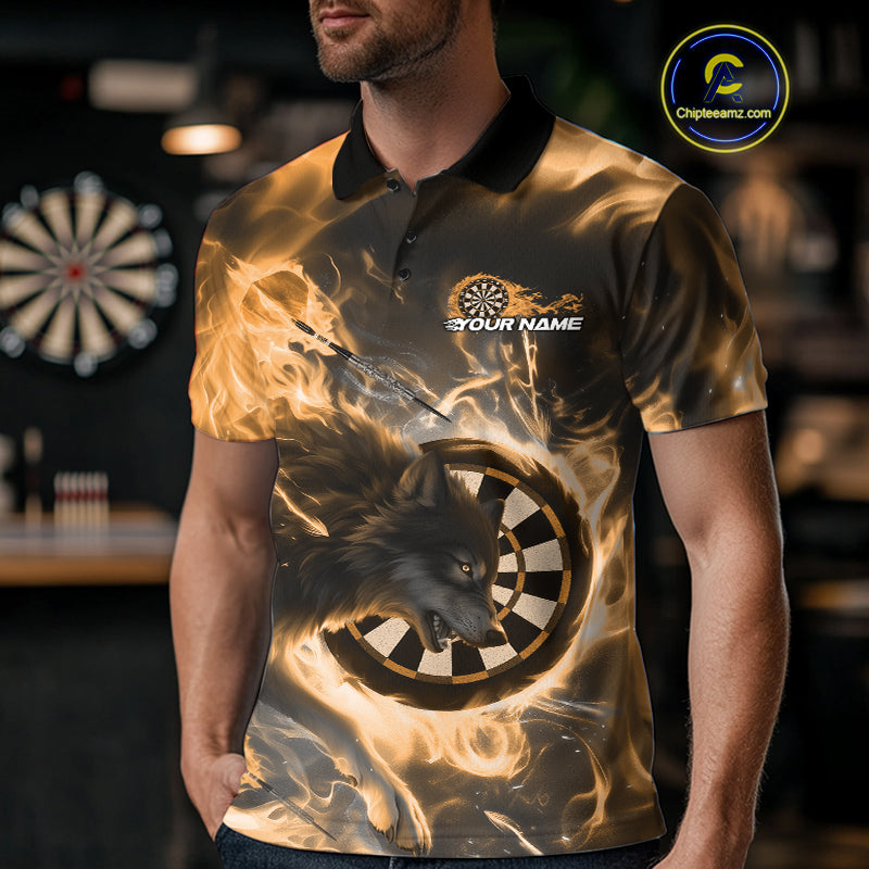 Custom Yellow Fire Flame Dart Wolf Men Polo Shirts, Dart League Shirt Team Jerseys IPHW10005