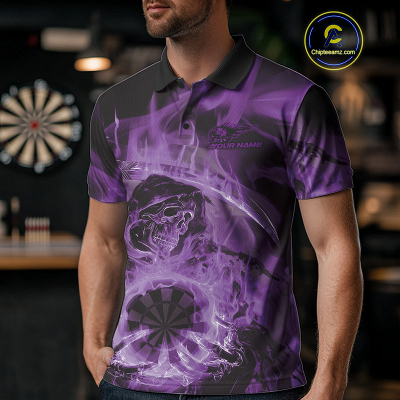Custom Purple Flame Grim Reaper Halloween Dart Men Polo Shirts For Team, Dart Jerseys IPHW10032