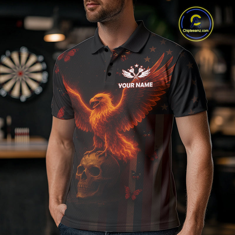 Custom US Flag Patriotic Polo Dart Shirt For Men Flame Eagle Skull Dart Jersey NYN1331