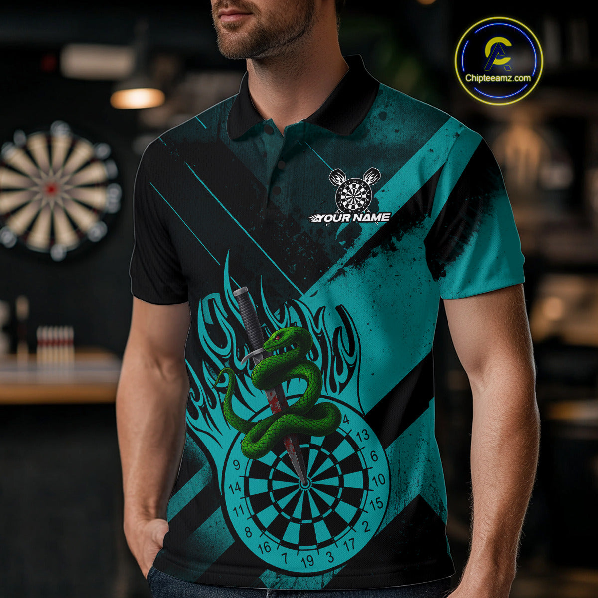 Custom Green Cobra Flames Dartboard Turquoise Grunge Dart Men Polo Jerseys Dart Shirt Gifts NYN1644