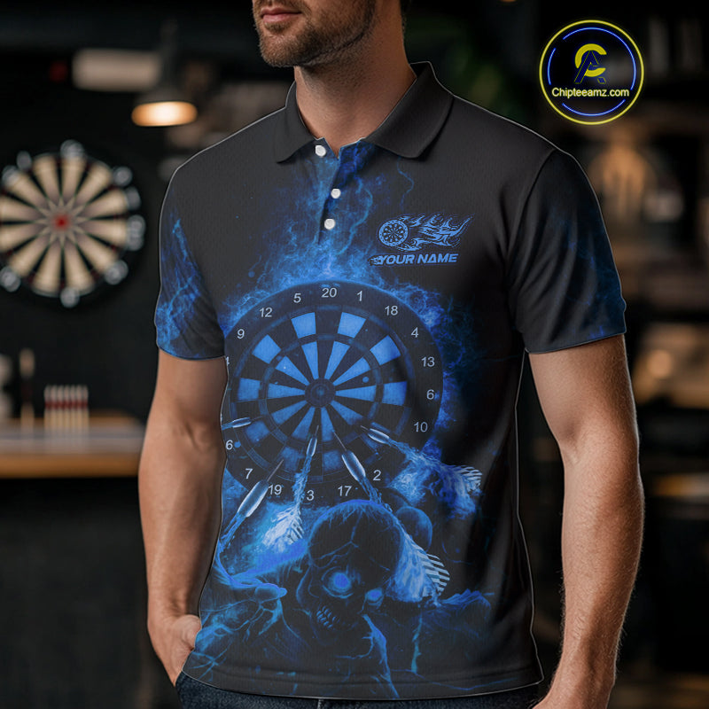Custom Skeleton Blue Flames Dartboard Dart Men Polo Jerseys Lightning Dart Team Shirt NYN1696
