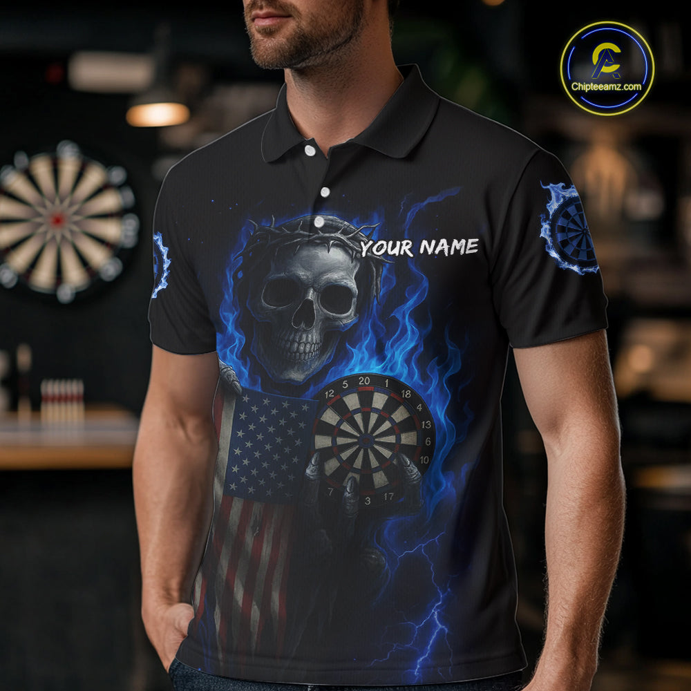 Custom Blue Flames Skeleton USA Flag Dart Men Polo Jerseys Patriotic Dart Team Shirt NYN1698